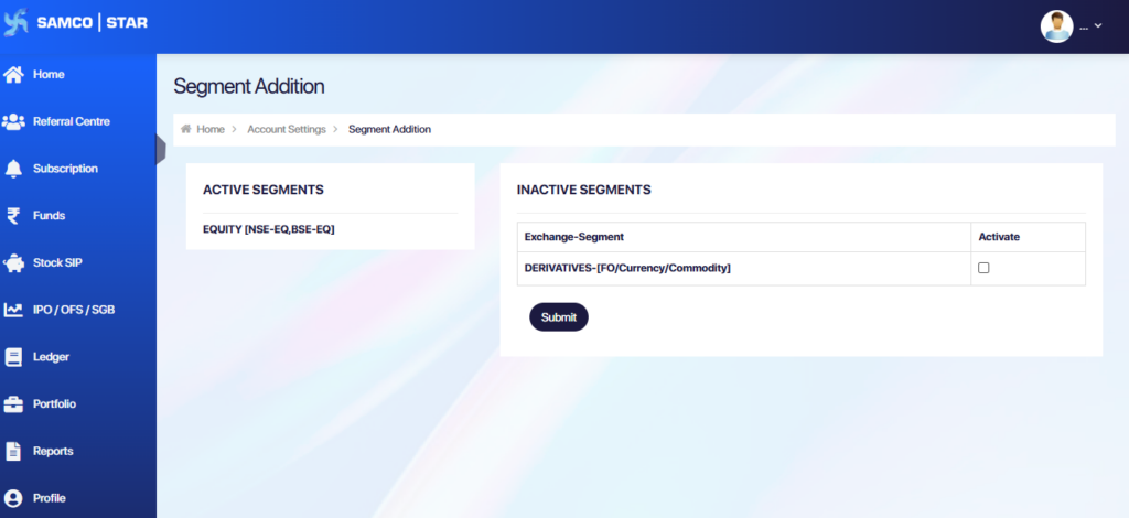 To begin trading in additional segments such as Equity Derivatives, Currency, or Commodities, it’s essential to first activate those segments in your SAMCO demat account. This ensures you’re fully compliant and authorized to trade in these markets.