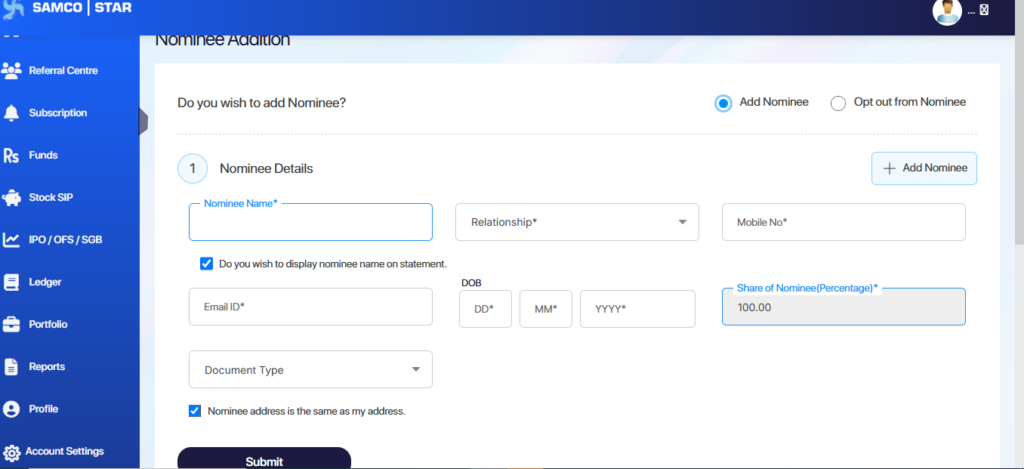 Once the address details are filled correctly, click Submit to complete the nominee registration process.