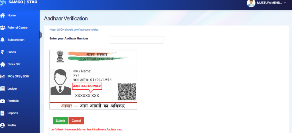 - Enter your 12-digit Aadhaar Number in the designated box.