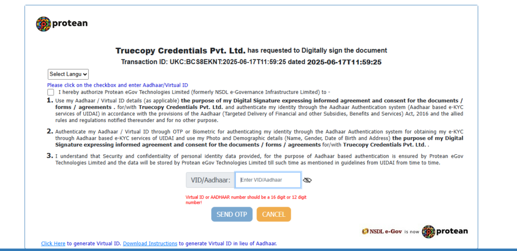 - You will be redirected to the Truecopy Credentials Pvt. Ltd. e-sign authorization page.
