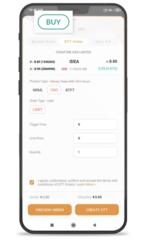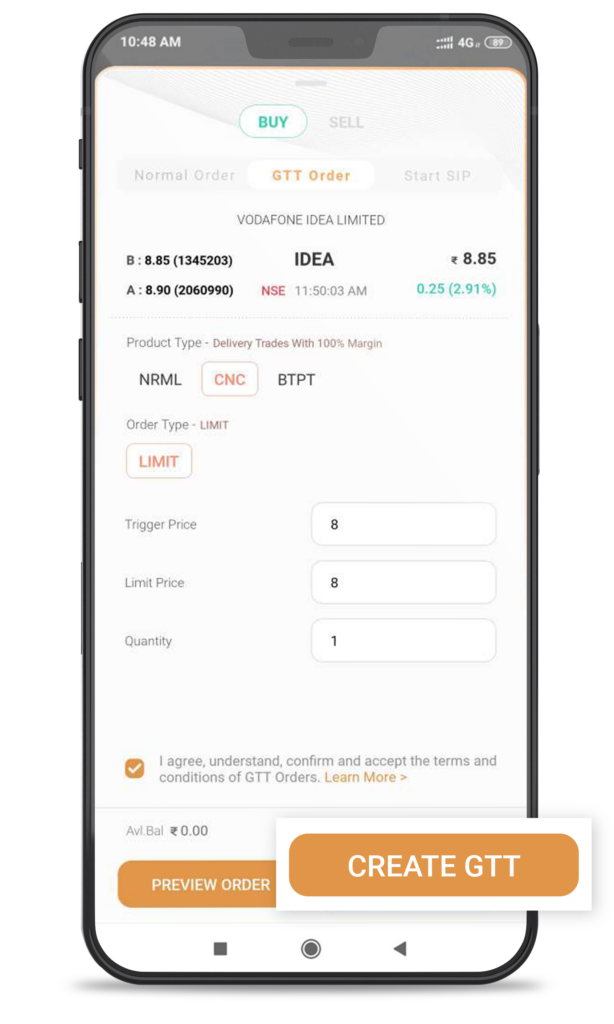 5. Then agree to the terms and agreement and tap on the ‘CREATE GTT‘ button and your order has been successfully created.