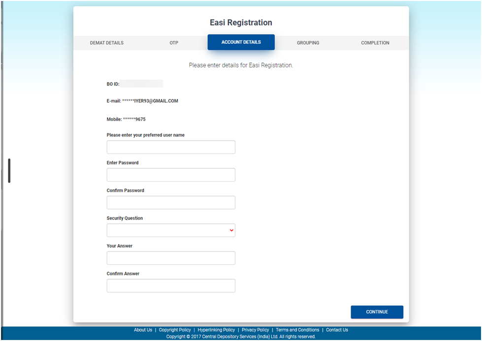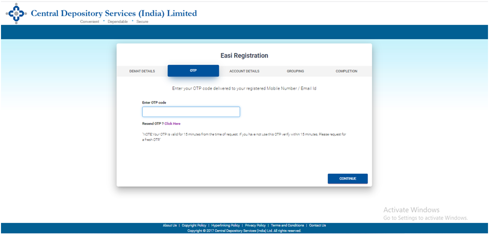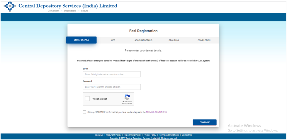 6. If multiple demat accounts are held by the same account holder, the demat ID of the accounts can be entered and grouped together. By grouping the demat IDs, multiple demat accounts can be accessed using a single user ID. Click on Continue, and the registration will be successful.