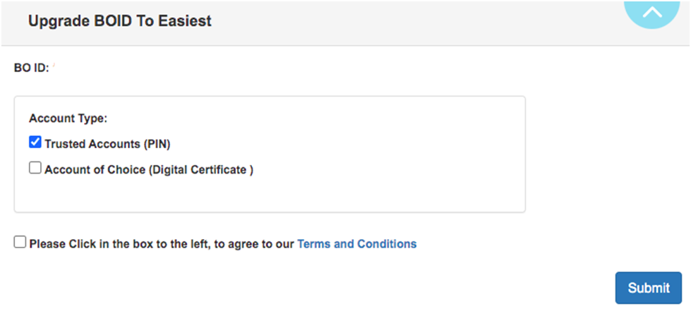 3. Select Trusted account (PIN) as the Account Type, agree to the terms and conditions and click on Submit.