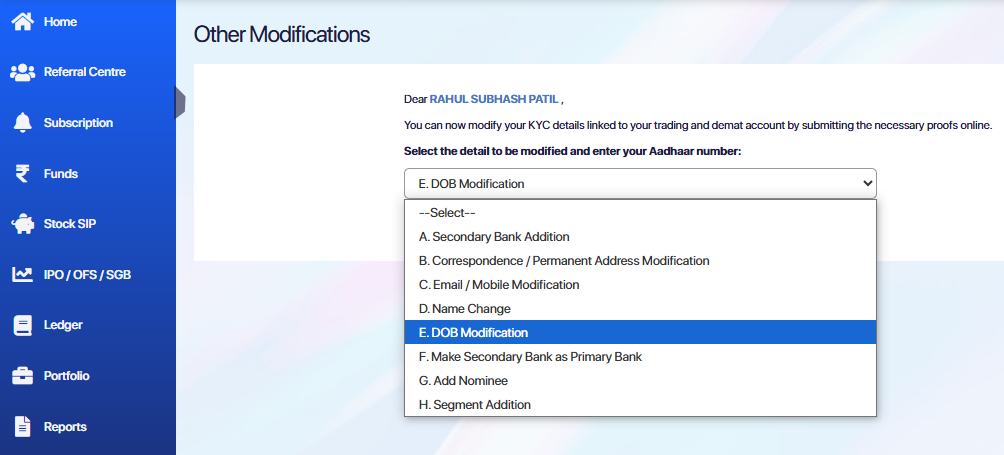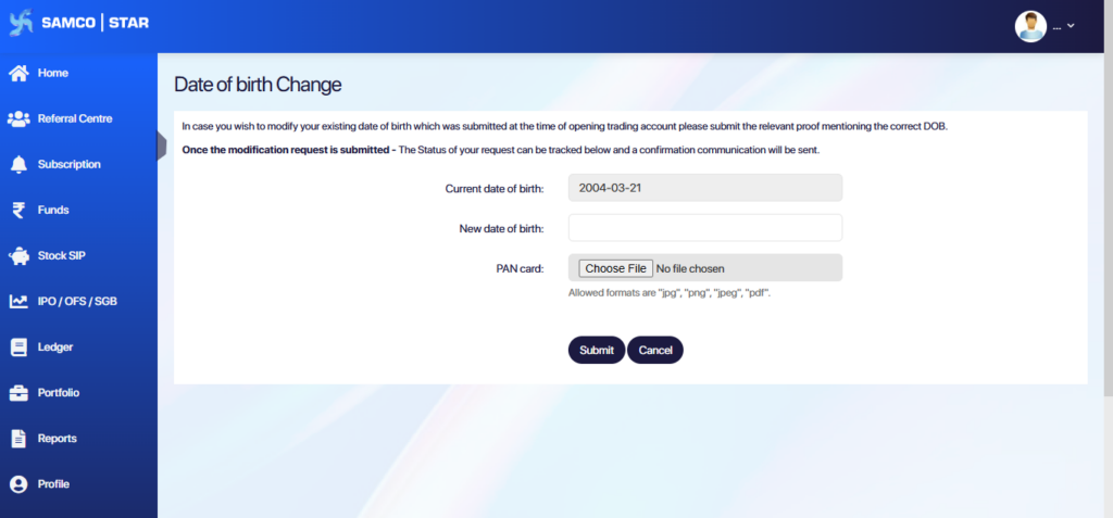 Once you’ve submitted your date of birth update request along with the necessary documents, it will enter the verification process. To stay informed about the progress, simply navigate to the ‘Modification Status’ tab in your Samco STAR Back Office.
