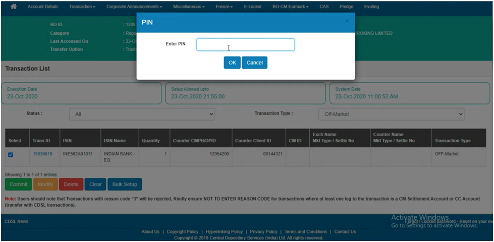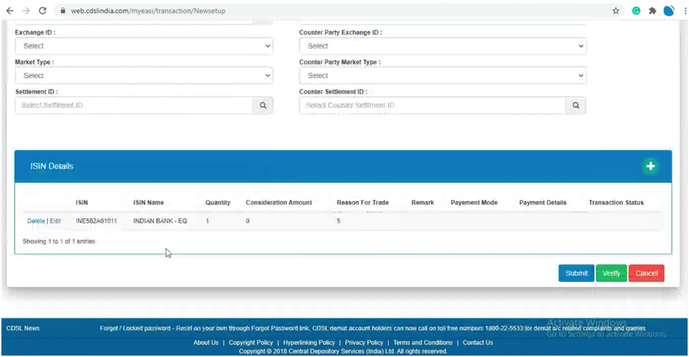 4. You need to select the ISIN. When you click on Account ISINs, you can see a list of all the ISINs in your holdings. Select the ISIN and enter the quantity and select the reason for trade from a list given.